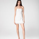 Introducing our Sequined White Feathered Mini Dress, a captivating masterpiece. Shimmering sequins and playful feather accents adorn this elegant, sleeveless design. The mini-length cut radiates confidence, perfect for special occasions. Make a statement at any event with this mesmerizing piece.